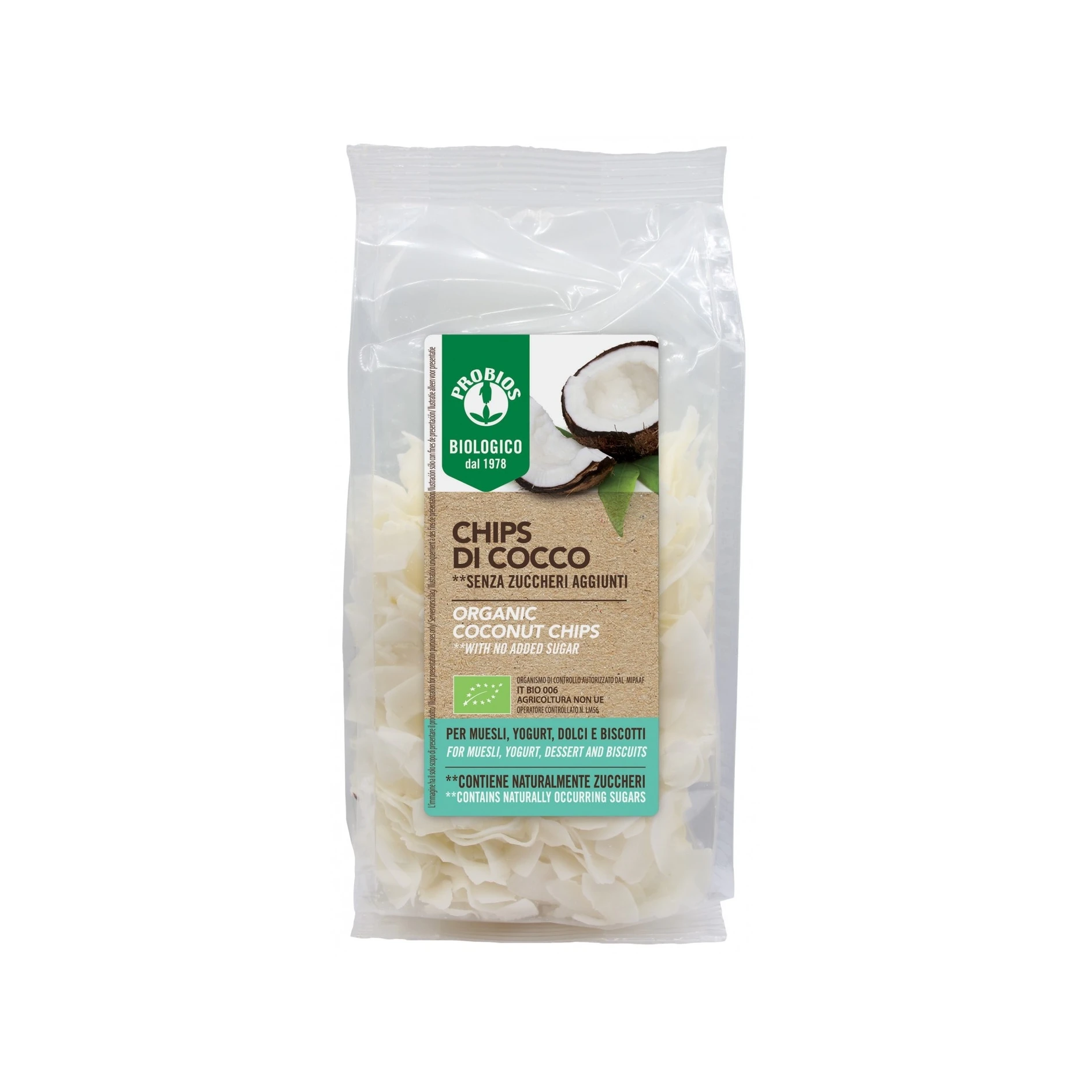 Le chips di cocco Probios, senza zuccheri aggiunti, sono ottime da aggiungere a muesli e yogurt, o per arricchire biscotti, dolci e ricette. Sono confezionate nella pratica busta apri e chiudi.