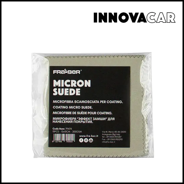 Micron Suede di Innovacar è il panno piccolo in microfibra scamosciata o microsuede realizzato appositamente per essere utilizzato con l’applicatore manuale Foam App Block, soluzione tecnica utilizzata spesso nelle fasi di coating.