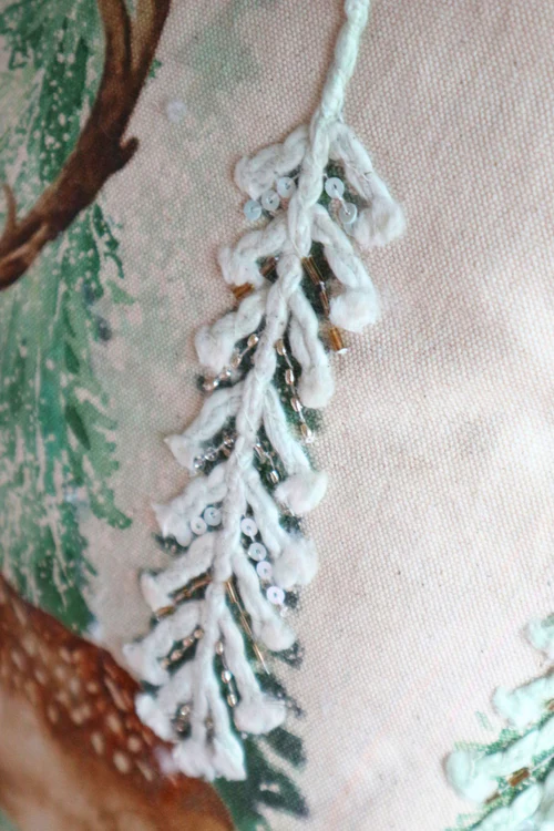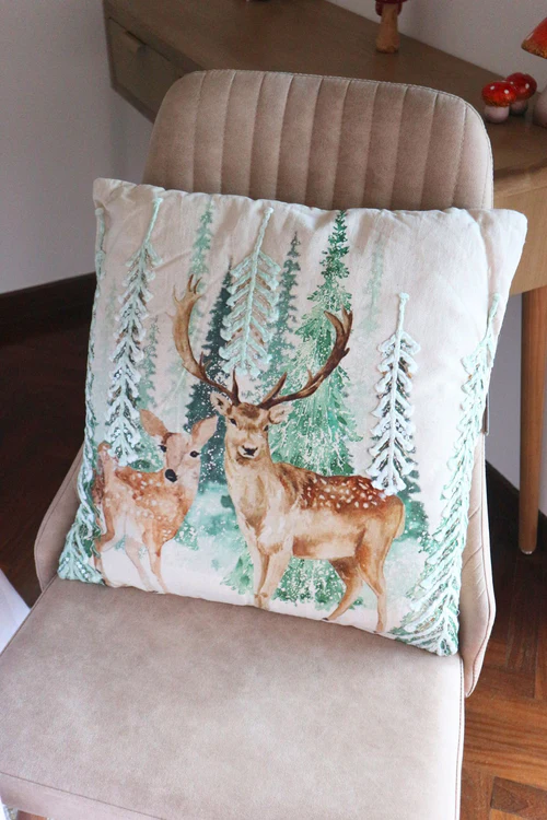 Cuscino decorativo Blanc Mariclò della serie Gran Paradiso, caratterizzato da una suggestiva stampa di paesaggio invernale con cervo, arricchita da raffinate lavorazioni in rilievo e delicate perline ricamate.