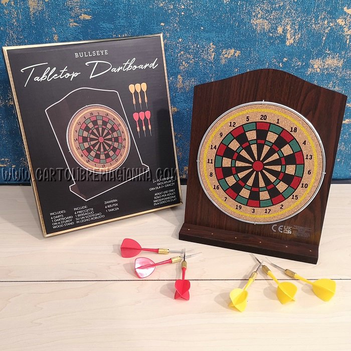 Classico gioco con tabellone e piedistallo in legno con fori adatti per fermare le freccette incluse.