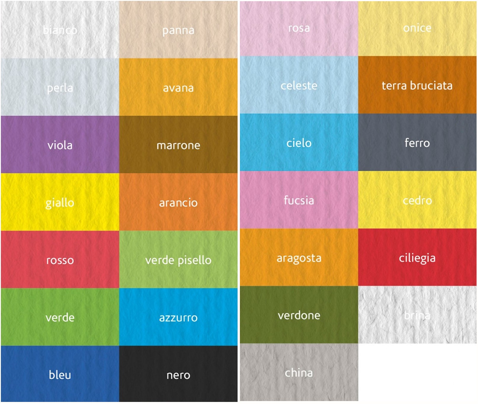 | Colore | Aragosta, AVANA, Avorio, Bianco, Blu, Brina, CELESTE, China, Cielo, Ciliegia, Ferro, Fucsia, Giallo, Grigio Perla, Marrone, Nero, Onice, Panna, Rosa, Rosso, Terra Bruciata, Verde, Verde Pisello, Viola, VIOLETTO |