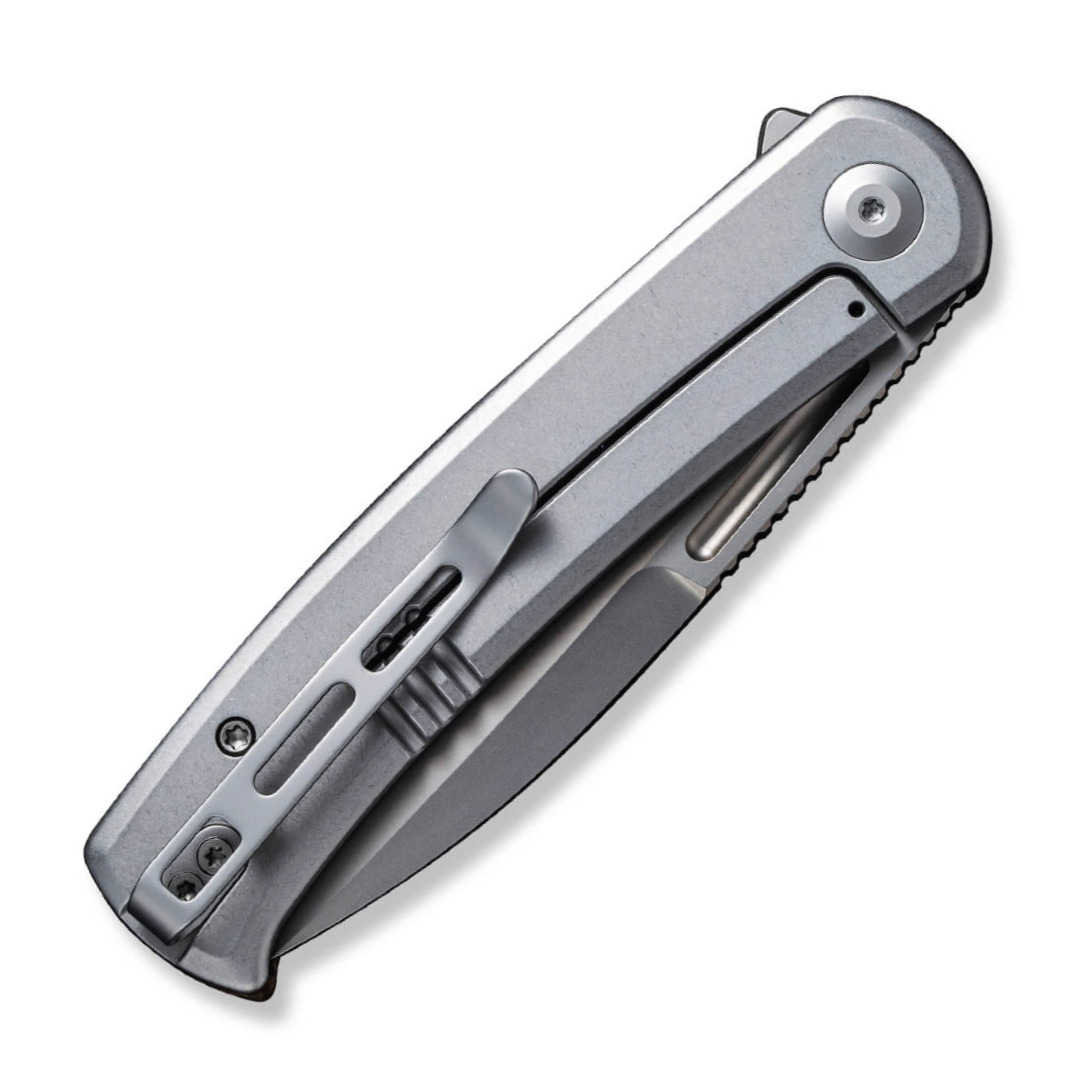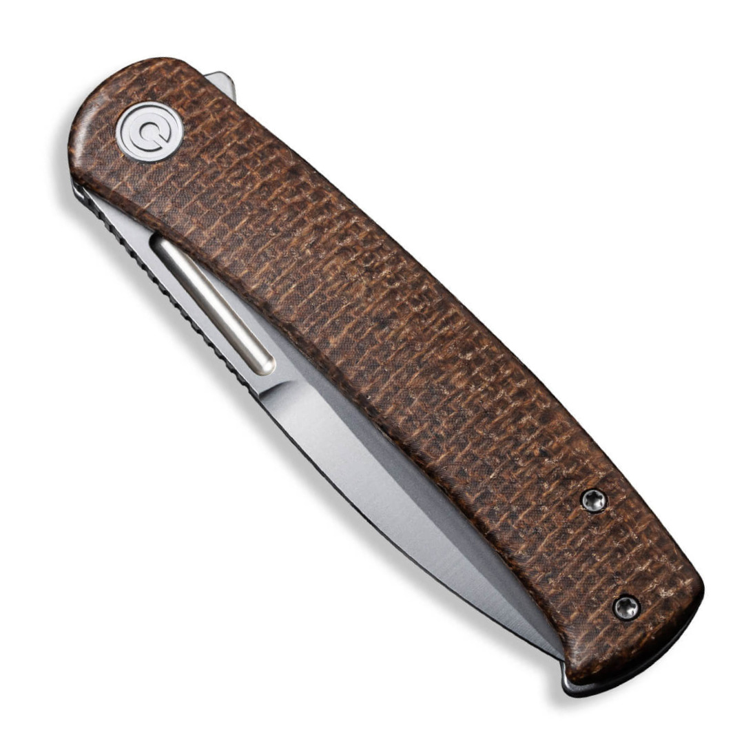 Il Civivi Cetos è un EDC sottile ed elegante. La lama Spearpoint con cuscinetti a sfera in 14C28N è dotata di una finitura Bead Blast e si apre dolcemente con flipper o in alternativa con taglio a chiodo. Il solido blocco del telaio in acciaio inossidabile fissa il coltello in modo affidabile, in modo che anche i lavori difficili passino senza sforzo dalla mano. Il manico anteriore è in Micarta marrone e sottolinea il fascino esplicito del coltello. Con clip (ribaltabile/r).